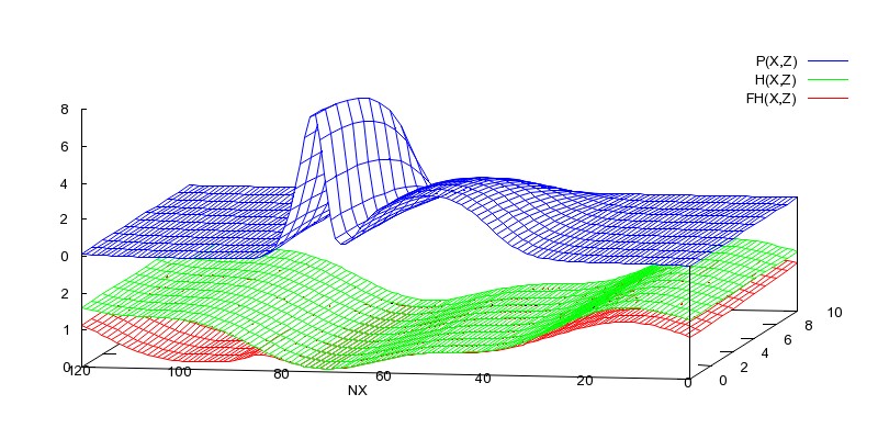 Bei diesem Beispiel treten Zustände auf, wo die Berechnung des Druckverlaufs zur Instabilität neigt. Das ist dann der Fall, wenn sich der Druckberg plötzlich teilt und sich dazwischen kurzeitig ein kleines Unterdruckgebiet bildet. Dem kann abgeholfen werden, indem der Gitterabstand DX und/oder die Zeitschrittweite DT verringert wird. Prinzipiell kann die Anfälligkeit der Berechnung gegen numerische Instabilitäten bei der Anwendung der erweiterten Schmiertheorie durch Verwendung einer großen Mischungskonstanten C verringert werden, weil dadurch die berechneten Druckverläufe runder werden.