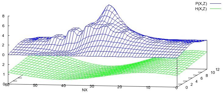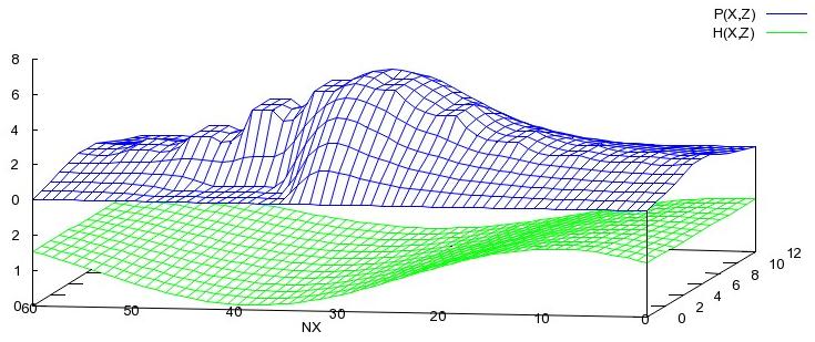 Die Bilder 10 und 11 zeigen den Druckverlauf P(X,Z) und die Spalthöhe H(X,Z) zu zwei Zeitpunkten, die um eine halbe Drehung versetzt sind.