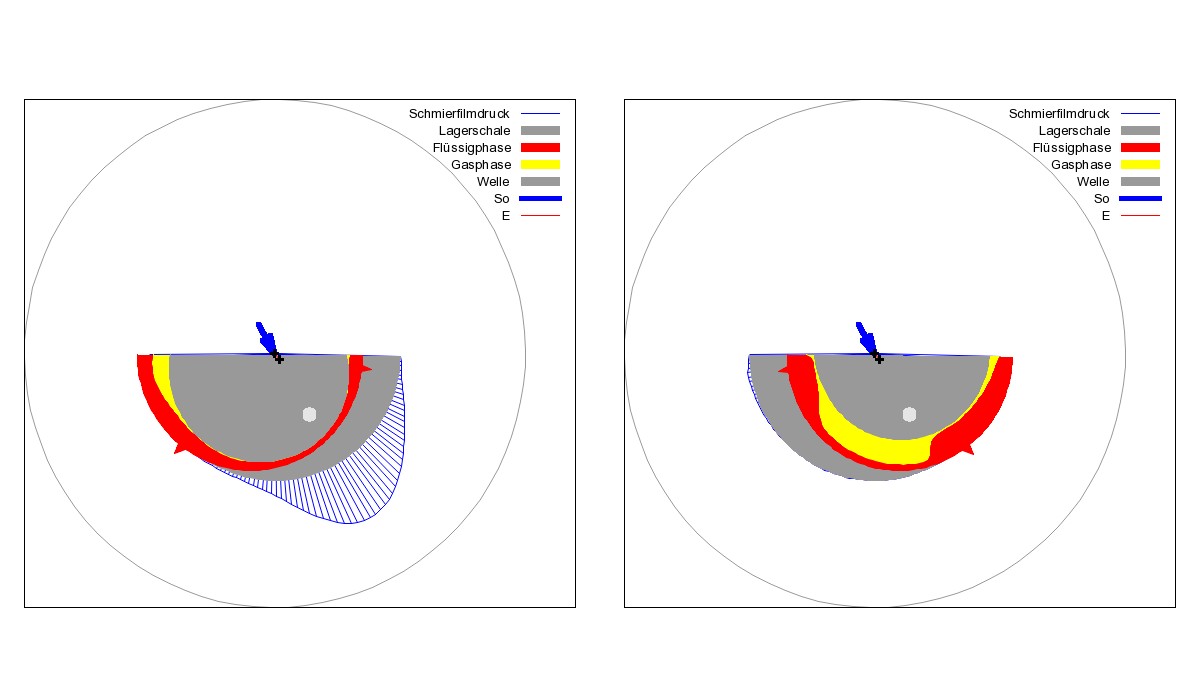 Kavitation im Gleitlager ist eine normale Erscheinung, die weder verhindert werden muss, noch generell verhindert werden kann. Für die Funktion des hier beschriebenen Gleitgelenks ist Kavitation eine notwendige Voraussetzung. Würde ein Schmiermittel keine Kavitation zulassen und statt dessen beim Abheben des Zapfens Zugspannungen aufbauen, würde sich der Zapfen an der Lagerschale festsaugen und damit das Auffüllen des Schmierspalts erschweren. Wichtig für die optimale Gestaltung eines Gleitgelenks mit versetzten Lagerabschnitten ist die genaue Kenntnis der Schmiermittelströmung im Kavitationsgebiet. Sie zeigt, wie sich der Schmierspalt in der Entlastungsphase wieder auffüllt, denn das ist eine Voraussetzung für die anschließende Tragfähigkeit des Lagerabschnitts in der Belastungsphase. Das Gleitlagerberechnungsprogramm SIRIUS verwendet eine erweiterte Reynoldssche Differentialgleichung zur Berechnung der Schmiermittelströmung und geht dabei von der Annahme eines Schmiermittel-Gas-Gemischs aus [1]. Mit dieser Gleichung kann die Strömung sowohl im Druckberg als auch im Kavitationsgebiet einschließlich der Übergänge genau berechnet werden. Durch die starken Schwankungen des Druckes und des Gasanteils im Schmiermittel, insbesondere an den örtlichen und zeitlichen Übergängen vom Druckberg in das Kavitationsgebiet, sind eine recht feine Gitterteilung der Schmierspaltfläche und geringe Zeitschrittweiten zur numerischen Berechnung erforderlich. Im oben gezeigten Beispiel wurde mit einer Gitterteilung von 180x40 Gitterpunkten für die halbe Lagerschale gearbeitet und mit 200 Zeitschritten über eine Lastperiode. Bild 8 zeigt für das oben beschriebene Gleitgelenk je zwei Halbschnitte durch das Gleitgelenk, jeweils einen durch den vorderen Lagerabschnitt und einen durch den hinteren Lagerabschnitt zu einem ausgewählten Zeitpunkt innerhalb eines Lastzyklusses von 200 berechneten Zeitpunkten. Die blaue schraffierte Kurve unterhalb der Lagerschale zeigt den Druckverlauf im Schmierspalt an. Die rote Fläche im Schmierspalt symbolisiert den Anteil der flüssigen Phase und die gelbe Fläche den Anteil der Gasphase im Schmierspalt. Zum ausgewählten Zeitpunkt Nr. 51 trägt der vordere Lagerabschnitt die volle Last, während im hinteren Lagerabschnitt die Gelenkachse abgehoben hat und Schmiermittel nachströmen kann. Die zugehörige Animation zeigt den zeitlichen Verlauf über den gesamten Lastzyklus.