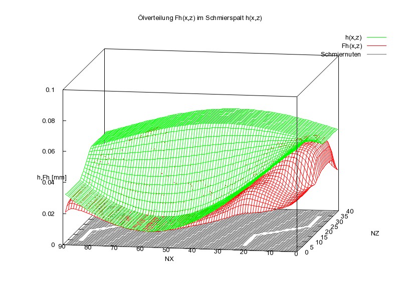 Bild 9 zeigt für das gleiche Gleitgelenk die Spalthöhe h(x,z) (grün) und darunter die Schmierflüssigkeitsverteilung Fh(x,z) (rot) über den abgewickelten Schmierspalt zum augewählten 51.Zeitpunkt. Die zugehörige Animation zeigt wieder den Lastzyklus.
