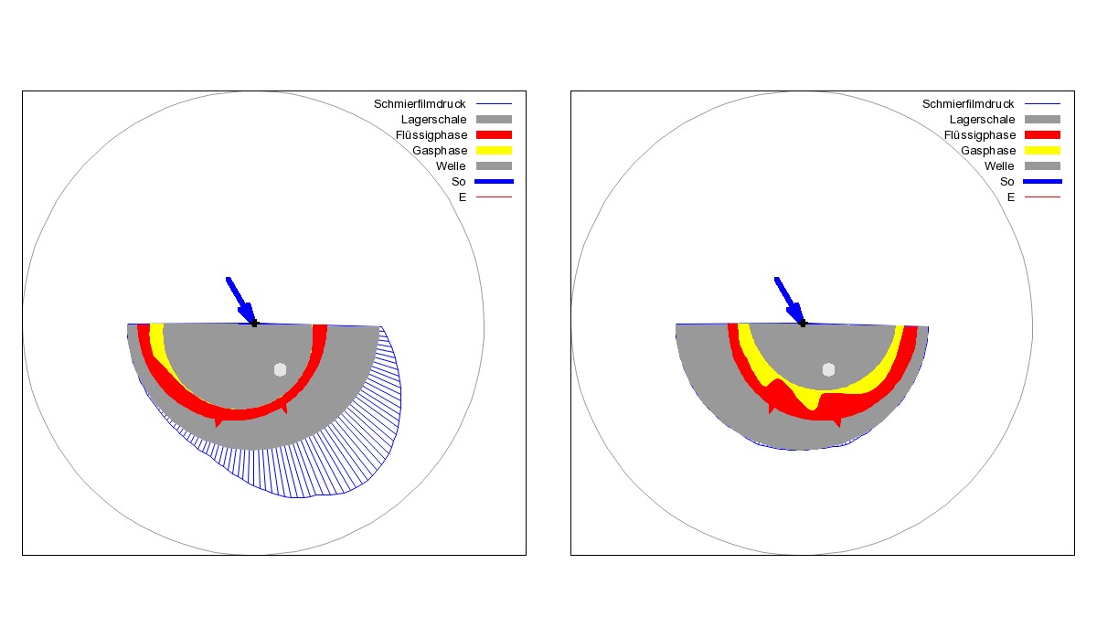 Bild 10 zeigt wieder 2 Schnitte durch je einen Lagerabschnitt zum 51.Zeitpunkt von 200 Zeitpunkten pro Lastzyklus. Die zugehörige Animation zeigt den Verlauf über den gesamten Lastzyklus. Durch die kürzeren Strömungswege füllt sich der entlastete Teil des Schmierspalts schneller trotz größerer Viskosität des Schmiermittels, so dass zu einem früheren Zeitpunkt der Schmierspalt bereits fast vollständig wieder gefüllt ist und sich Druck aufbauen kann.