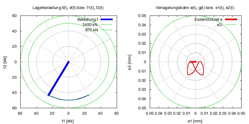 Bild 11: Belastungsverlauf und stationäre Verlagerungsbahn des Gleitgelenks mit 2 versetzten Lagerabschnitten und 4 axialen Schmiernuten mit Rückschlagventilen (Animation über einen Lastzyklus)