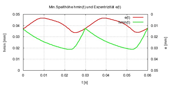 Bild 12: Verlauf der Exzentrizität e(t) und der minimalen Schmierspalthöhe hmin(t) über eine Lastperiode des Gleitgelenks mit versetzten Lagerabschnitten und 4 axialen Schmiernuten mit Rückschlagventilen