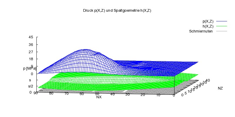 Ergänzend zu dem bisher gezeigten, zeigt Bild 13 nun noch den Druckverlauf p(x,z) (blau) und die Spalthöhe h(x,z) (grün) über den abgewickelten Schmierspalt nach 50 von 200 Zeitpunkten über den Lastzyklus und die zugehörige Animation den gesamten Lastzyklus.