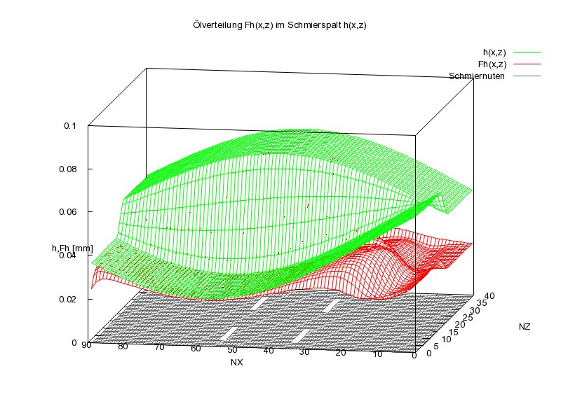 Bild 14 zeigt analog dazu die Spalthöhe h(x,z) (grün) und darunter den Flüssigkeitsanteil Fh(x,z) (rot) und in der Animation den Verlauf über den gesamten Lastzyklus.