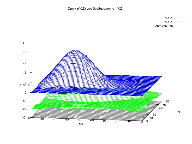 Bild 18 zeigt den Druckverlauf p(x,z) (blau) und die Schmierspalthöhe h(x,z) (grün) über die abgewickelte Schmierspaltfläche. Die zugehörige Animation zeigt die Druckverteilung und die Spalthöhen über den gesamten Lastzyklus