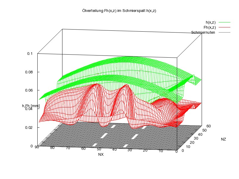 Der Vollständigkeit halber soll auch hier noch die Flüssigkeitverteilung im Schmierspalt gezeigt werden. Bild 19 zeigt wieder die Spalthöhe h(x,z) (grün) und darunter die Flüssigkeitsverteilung Fh(x,z) (rot) über den abgewickelten Schmierspalt. Da die Flüssigkeitsverteilung Fh in diesem Bild durch die Spaltgeometrie zum Teil verdeckt wird, zeigt Bild 20 nur die Flüssigkeitsverteilung Fh(x,z). Die zugehörigen Animationen zeigen wieder den Verlauf über den gesamten Lastzyklus.