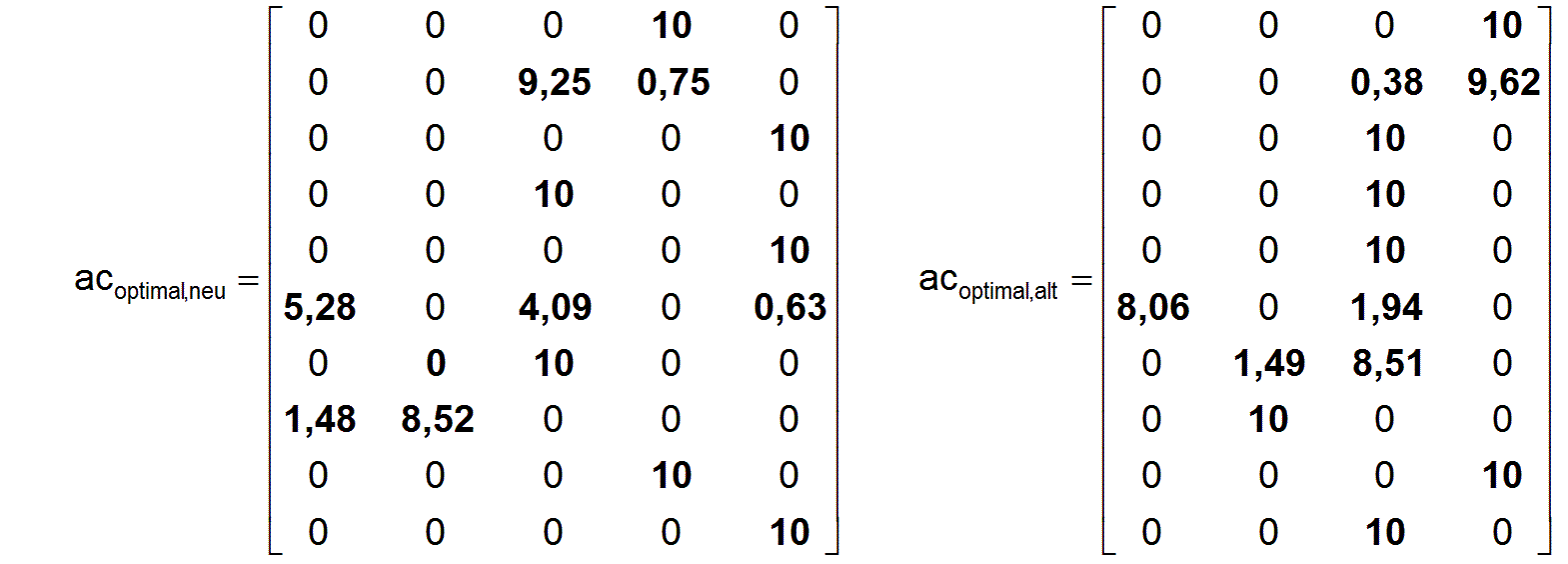 Die Simulationsrechnung über n4=300 Zyklen konvergiert ähnlich, wie das ursprüngliche Beispiel. Es ergibt sich natürlich eine andere optimale Beschäftigungsmatrix ac