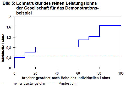Anhand unseres ursprünglichen Demonstrationsbeispiels können wir für die Gesellschaft, bestehend aus 100 Arbeitern, das Lohn- bzw. Einkommensprofil darstellen, indem wir ein Diagramm zeichnen, in dem für jeden Arbeiter geordnet nach Größe seines individuellen Lohnes dieser Lohn über die Anzahl der Arbeiter aufgetragen wird. So entsteht das Bild der Lohnstruktur der Gesellschaft. Das ist in Bild 5 dargestellt.