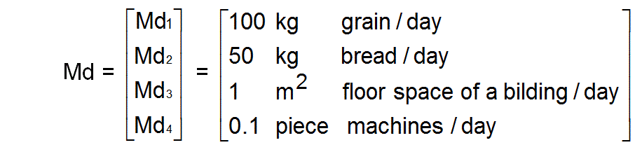 This means that the work performance of 2 × 100 kg of grain per day, 2 × 50 kg of bread per day, 3 × 1 m2 of floor space of a building per day, and 4 × 0.1 machines per day represent a needs-based performance structure.