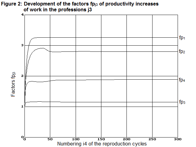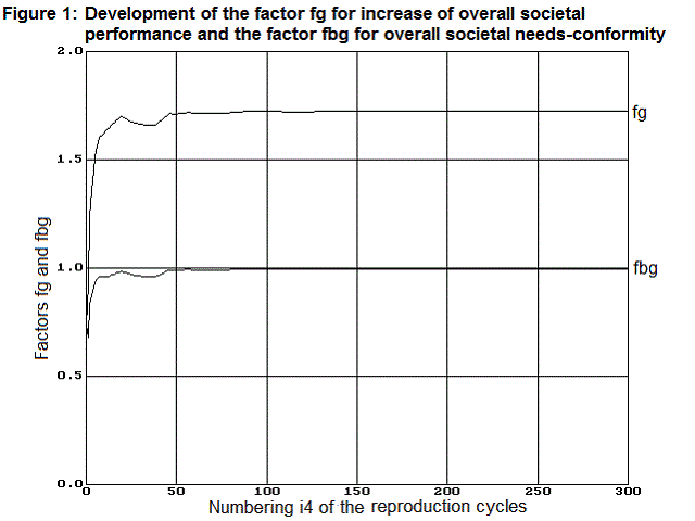Over n4=300 reproduction cycles have been calculated. In our example the model of the labor market actually converges to the optimal employment matrix acoptimal, as we have already calculated in another way. After approximately 100 reproduction cycles the maximum increase in performance and the needs-based work performance are achieved. The maximum increase in performance is represented using the factor fg (and separately using the factors fpj3). The needs-based work performance is represented using the factor fbg (and separately using the factors fbj3).