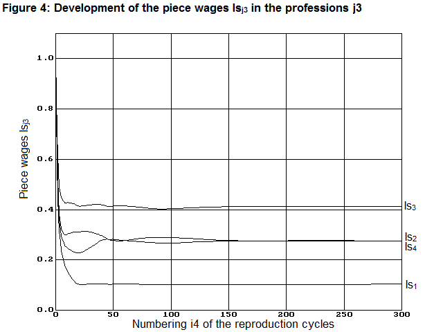 A test calculation has already been executed with the demonstration example mentioned earlier. In addition to the predefined time-invariant parameters "productivity matrix p", "productivity group sizes ap" and "needs-based performance structure db0 or dbn" the non-optimal employment matrix ac was assumed as the initial parameter. A vector Is of piece wages, which serve as initial values has to be added to this data record. This vector ls of piece wages does not have to be optimal since self-optimization is expected within the simulation calculation, too. An arbitrary starting vector was determined by