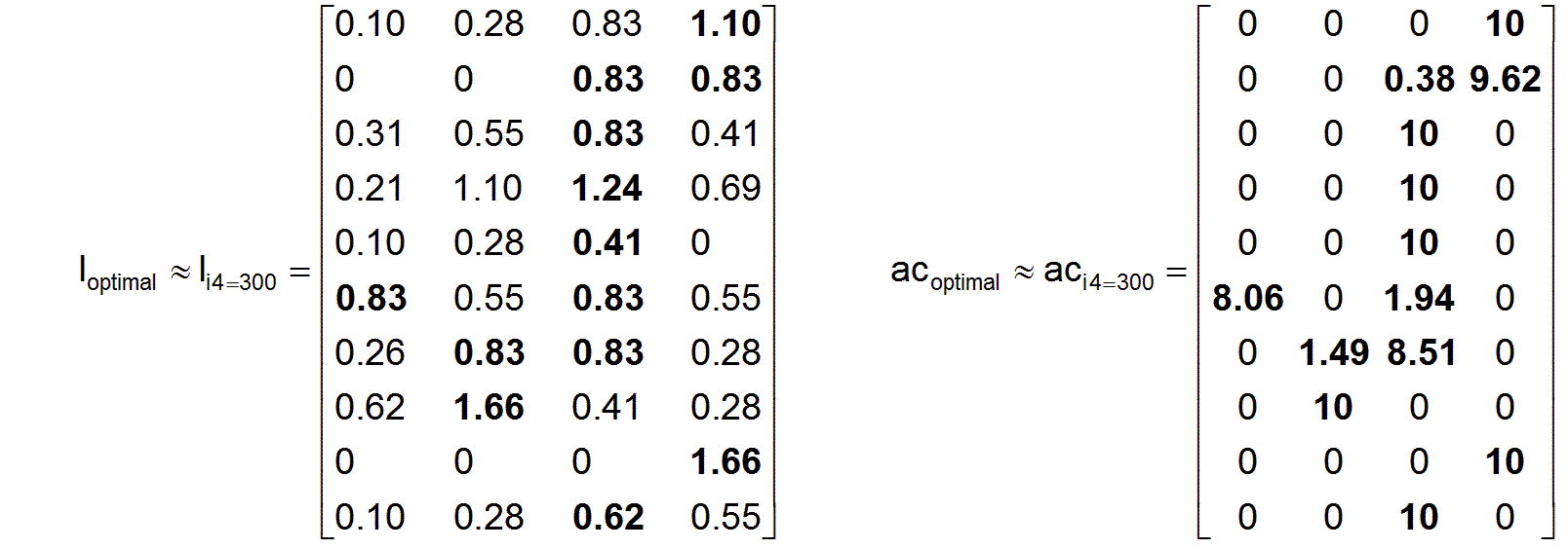 The simulation program also provides the matrix of the individual wages li4=300 after 300 reproduction cycles. Together with the employment matrixaci4=300 » acoptimal, which corresponds to the optimal employment matrix, it shows which wages the workers actually receive in their current professions and also which wages they are (would be) receiving in other professions at the same time. The realized wages are highlighted in bold in the matrix li4=300 given below. In addition the associated employment matrix is also given here.