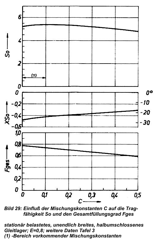 Im folgenden Berechnungsbeispiel (Bild 28, 29) wurde die Mischungskonstante C im großen Intervall 0≤C≤0,5 variiert, um ihren Einfluß auf die Druckentwicklung und Ölverteilung im Lager zu ermitteln. bei kleinen Mischungskonstanten c nähert sich der Druckverlauf p(x) und der Verlauf des örtlichen Füllungsgrades f(x) denen von Modell 2. Bei großen Mischungskonstanten verwischen sich die Übergänge zwischen Druckberg und Unterdruckgebiet immer mehr. Im gesamten Intervall zeigt sich jedoch nur ein geringer Einfluß auf die Tragfähigkeit. Das wird auch bestätigt durch Experimente von Carl [13]. Er beschreibt Versuche mit künstlich verschäumtem Öl, bei denen sich durch die Verschäumung keine Tragfähigkeitsverluste zeigten. Damit entfällt die Mischungskonstante C als zusätzlich zu bestimmende Stoffkennzahl, was die Arbeit mit dem Modell erleichtert. Die Mischungskonstante C spielt eine Rolle im Druck-Volumen-Gesetz des Gemischs