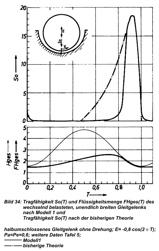 Für ein halbumschlossenes, unendlich breites Gleitgelenk wurde folgende Verlagerungsbahn vorgegeben (134) E = 0,8·cos(2·π·T) (135) γ = 0 Es wurden der Druckverlauf P(X,T), der örtliche Füllungsgrad F(X,T) und die Flüssigkeitsverteilung FH(X,T) nach Modell 1 berechnet. Bild 33 zeigt die Ergebnisse für eine vollständige Lastperiode T= 0 bis 1 (nach einer Anlaufrechnung von T= -0,5 bis 0). Die linke Seite des Diagramms zeigt die Ergebnisse im Zeitraum 0 bis 0,5 ‚ in dem sich die Schmierspalthöhe vergrößert. Es zeigt sich, daß der Nachstrom von den Schmiernuten her nur zögernd erfolgt. Dies wird bestätigt durch die Experimente von Gnilke [15] am durchsichtigen, wechselnd belasteten Gleitgelenk.(Leider sind die Versuche nicht quantitativ auswertbar.) Die rechte Seite des Diagramms zeigt die Verhältnisse im Zeitraum 0,5 bis 1 ‚ während sich der Schmierspalt wieder verengt. Der Ölzustrom geht zunächst weiter. Danach wird die zugeströmte Schmiermittelmenge breitgequetscht bis wieder ein vollständiger Schmierfilm entstanden ist. Bis zu diesem Zeitpunkt erfolgt kein nennenswerter Druckaufbau. Im Diagramm für den Druckverlauf F(X) sind die Druckverläufe eingetragen, wie sie sich bei unvollständig gefülltem Schmierspalt entsprechend Modell 1 ergeben (Vollinie) und zum Vergleich, wie sie sich nach der bisherigen Theorie ergeben würden bei vollständig gefülltem Spalt (Strich-Punkt-Linie). Der eigentliche Druckaufbau erfolgt erst nach Bildung eines geschlossenen Schmierfilms und stimmt dann mit der bisherigen Theorie überein. Bild 34 zeigt für das gleiche Beispiel den zeitlichen Verlauf der Sommerfeldzahl So(T) und die Gesamtflüssigkeitsmenge FHges(T) im Schmierspalt. Zum Vergleich ist der Verlauf der Sommerfeldzahl bei gleicher Verlagerungsbahn und der Annahme eines ständig gefüllten Schmierspalts eingetragen (Strich-Punkt-Linie). Es zeigt sich ein erheblicher Tragfähigkeitsverlust infolge der verzögerten Schmierspaltfüllung. Im praktischen Fall ist jedoch nicht die Verlagerungsbahn vorgegeben, sondern die Lagerbelastung. Hier würde nach Umkehr der Lastrichtung nicht ein verspäteter Druckaufbau stattfinden, sondern die Welle würde soweit durchfallen, bis die Ölmenge, die zu diesem Zeitpunkt vorhanden ist, einen vollständigen Film gebildet hat. Das bedeutet eine Verringerung der Impulsaufnahmefähigkeit des Schmierfilms durch die verzögerte Ölzufuhr und führt zu einer größeren Exzentrizität. Der praktische Wert dieser Untersuchungen würde sich erhöhen, wenn die Anwendung der erweiterten Theorie im Zusammenhang mit einer Verlagerungsbahnberechnung aus einem vorgegebenen Belastungsverlauf erfolgen würde. Da die erweiterte Schmiertheorie die Ölnachströmverhältnisse berücksichtigt, bietet sich die Möglichkeit, die Höhe des Ölzufuhrdrucks und die Lage der Schmiernuten zu optimieren. Dazu wurden am Beispiel des wechselnd belasteten Gleitgelenks Variationsrechnungen durchgeführt (Bild 35). Bei gleicher Schmiernutanordnung (halbumschlossenes Lager) und gleicher Verlagerungsbahn wurde der Zufuhrdruck variiert. Bei der Variante mit dem größeren Zufuhrdruck ist die Impulsaufnahme pro Lastspiel erwartungsgemäß größer als bei der mit kleinerem Zufuhrdruck. Dieser Unterschied ist allerdings nur zum geringen Teil auf einen erhöhten hydrostatischen Druckanteil zurückzuführen. Er beruht hauptsächlich auf der besseren Ölzuführung, was zu einem zeitigeren Druckaufbau führt. Das Optimum für den Zufuhrdruck würde dann dort liegen, wo der konstruktive Aufwand zur Erhöhung des Zufuhrdrucks gerade noch eine ausreichende Erhöhung der Tragfähigkeit bringt. Bei gleichem Ölzuführungsdruck und gleicher Verlagerungsbahn wurde die Lage der Schmiernuten variiert (halbumschlossenes und ein Drittel umschlossenes Lager). Nach der bisherigen Theorie würde sich für das halbumschlossene Lager aufgrund der größeren tragenden Fläche eine größere Impulsaufnahme ergeben. Die Berechnung nach der erweiterten Theorie ergibt aber eine höhere Impulsaufnahme für das Lager mit kleinerer tragender Fläche. Die Ursache für die größere Impulsaufnahme ist die verbesserte Nachstrombedingung durch den kürzeren Strömungsweg. Der Vorteil des zeitigeren Druckaufbaus ist in diesem Fall größer als der Nachteil der kleineren tragenden Schmierspaltfläche. Eine weitere wesentliche Verkleinerung der Spaltfläche würde den Vorteil der verbesserten Nachströmung allerdings wieder zunichte machen. Dadurch ist die Möglichkeit der Bestimmung eines Optimums gegeben. Die Untersuchungen wurden hier zur Ableitung von Tendenzen nur am unendlich breiten Lager durchgeführt. Falls derartige Untersuchungen für konkrete Lagerkonstruktionen ausgeführt werden sollen, wo es auf quantitativ richtige Ergebnisse ankommt, ist die Berücksichtigung der endlichen Breite erforderlich, da der Lagerrand als Stelle des Ölzuflusses und -abflusses Bedeutung hat. Dafür wurden ebenfalls die rechentechnischen Voraussetzungen geschaffen. Bild 36 zeigt für ein endlich breites, halbumschlossenes Gleitgelenk mit vorgegebener Verlagerungsbahn (wie oben) den zeitlichen Verlauf der Sommerfeldzahl So(T) und die Gesamtflüssigkeitsmenge FHges(T), berechnet nach Modell 1. Es zeigt sich qualitativ das gleiche Verhalten wie beim unendlich breiten Lager. Die Ölzufuhr verbessert sich etwas durch die Berücksichtigung des Lagerrandes. zurück weiter