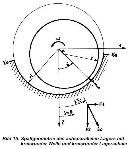 Für das achsparallele Lager mit kreisrunder Welle und kreisrunder Lagerschale ergibt sich die Spaltgeometrie (Bild 15) durch