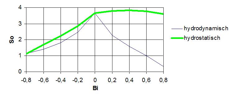 Bild 4 zeigt den Vergleich der Tragfähigkeiten von hydrodynamischem und hydrostatischem Lager über den Parameter Wellenbiegung Bi.