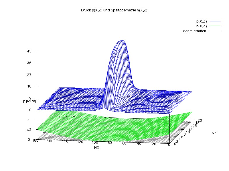 Bild 3 zeigt zum gleichen Zeitpunkt wie in Bild 2 den Druckverlauf p (blau) und die Spalthöhe h (grün) über die abgewickelte Schmierspaltfläche. Die hellen Streifen im grauen Gitternetz unterhalb der Darstellung der Spalthöhe stellen die Lage der zwei Schmiernuten dar.