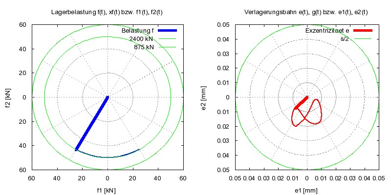 Bild 16: Belastungsverlauf und stationäre Verlagerungsbahn des Gleitgelenks mit 3 versetzten Lagerabschnitten und 6 axialen Schmiernuten mit Rückschlagventilen (Animation über einen Lastzyklus)