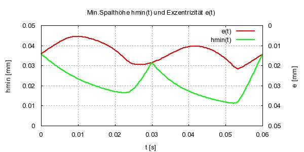 Bild 16 (rechtes Diagramm) zeigt die Verlagerungsbahn für ein dreigeteiltes Gleitgelenk mit den gleichen Lagerabmessungen und gleicher Lagerbelastung, wie in den vorhergehenden Beispielen und Bild 17 zeigt dazu den Verlauf der minimalen Spalthöhe hmin(t) und der Exzentrizität e(t) über einen Last- und Bewegungszyklus. Offenbar ist hier die Aufteilung der Lagerabschnitte noch nicht optimal. Das zeigt sich daran, dass die beiden lokalen Minima im Verlauf der minimalen Spalthöhe hmin(t) nicht gleich sind.