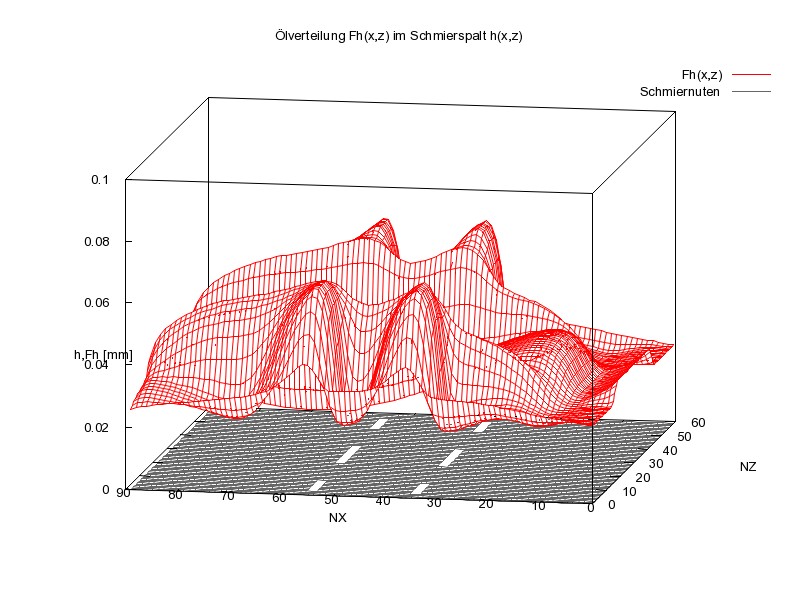 Der Vollständigkeit halber soll auch hier noch die Flüssigkeitverteilung im Schmierspalt gezeigt werden. Bild 19 zeigt wieder die Spalthöhe h(x,z) (grün) und darunter die Flüssigkeitsverteilung Fh(x,z) (rot) über den abgewickelten Schmierspalt. Da die Flüssigkeitsverteilung Fh in diesem Bild durch die Spaltgeometrie zum Teil verdeckt wird, zeigt Bild 20 nur die Flüssigkeitsverteilung Fh(x,z). Die zugehörigen Animationen zeigen wieder den Verlauf über den gesamten Lastzyklus.