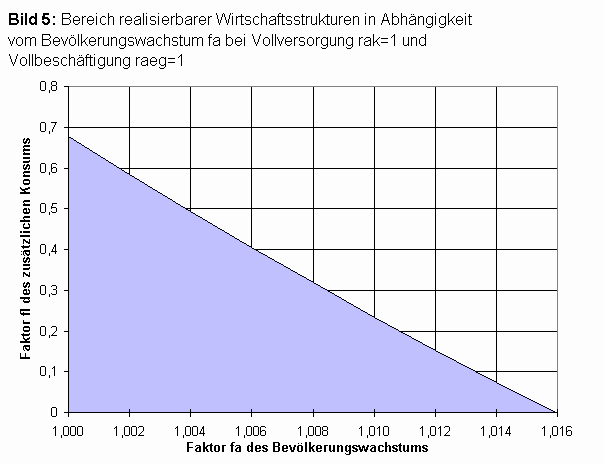 Bei vollständigem Verzicht auf zusätzlichen Konsum fl=0, Vollversorgung rak=1 und Vollbeschäftigung raeg=1 lässt in unserem Demonstrationsbeipiel die Produktivität einen Bevölkerungswachstumsfaktor von fa=1,0159 im Reproduktionszyklus zu, einschließlich des dafür nötigen Wirtschaftswachstums.