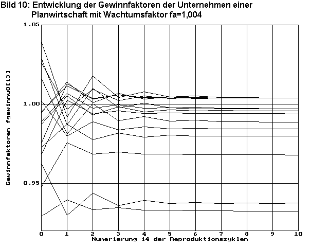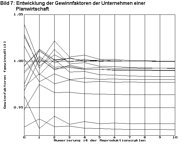 Bild 7 zeigt die Entwicklung der Unternehmensgewinne dargestellt durch die Gewinnfaktoren fgewinnu0i2 (Definition siehe Gleichung (19)). Da bei fa=1 kein Bevölkerungswachstum stattfindet und technischer Fortschritt auch nicht angenommen wird, findet auch kein Wirtschaftswachstum statt. Deshalb müssen die Gewinnfaktoren der Unternehmen, die an der optimalen Wirtschaftsstruktur beteiligt sind, gegen Eins streben. Es ist gut zu erkennen, wie die Gewinnfaktoren von 5 Unternehmen bereits nach ca. 10 Reproduktionszyklen gegen Eins streben. Das ist eine direkte Folge der schnellen Konvergenz der Preise zu den Optimalwerten. Die Gewinnfaktoren aller anderen Unternehmen ordnen sich darunter an, d.h. sie sind nicht konkurrenzfähig.