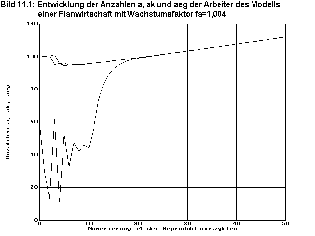 zeigt wieder die Gewinnfaktoren fgewinnu0i2. Es ist zu erkennen, dass sich jetzt die Gewinnfaktoren der 5 Unternehmen, die an der optimalen Wirtschaftsstruktur beteiligt sind, auf einen einheitlichen Gewinnfaktor über Eins, nämlich bei 1,004, einpegeln. Die Gewinnfaktoren der nicht konkurrenzfähigen Unternehmen liegen wieder darunter.Bild 11.1 zeigt wieder die Entwicklung der Bevölkerungszahl a, die Anzahl ak der versorgten Arbeiter und die Anzahl aeg der beschäftigten Arbeiter über die ersten 50 Reproduktionszyklen. Auch hier gibt es den anfänglichen Einbruch in der Bevölkerungszahl, die nach ca. 6 Reproduktionszyklen wieder zu wachsen beginnt. Bild 11.2 zeigt den selben Sachverhalt diesmal über 200 Reproduktionszyklen. Es ist zuerkennen, wie nach ca.20 Zyklen das ursprüngliche Niveau von 100 Arbeitern wieder erreicht ist und danach die Bevölkerung und demnach auch die Wirtschaft mit dem Faktor 1,004 pro Reproduktionszyklus kontinuierlich weiter wächst. Falls keine weitere Störung eintritt, wird in diesem Beispiel die Bevölkerung und die Wirtschaft weiter wachsen, bis die Ware i3=6 (Grund und Boden), die nicht produziert werden kann, sondern ohne zu verschleißen nur benutzt wird, vollständig in Gebrauch ist. Aber dazu später.