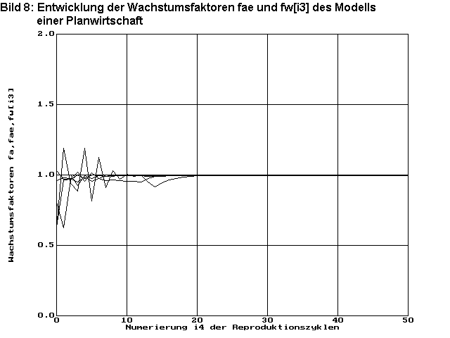 Bild 8 zeigt die Faktoren der Warenakkumulation fwi3 ,die bei fa=1 gegen Eins streben müssen. Hier ist nach anfänglichen starken Schwankungen innerhalb von 20 Reproduktionszyklen das Optimum ebenfalls erreicht.