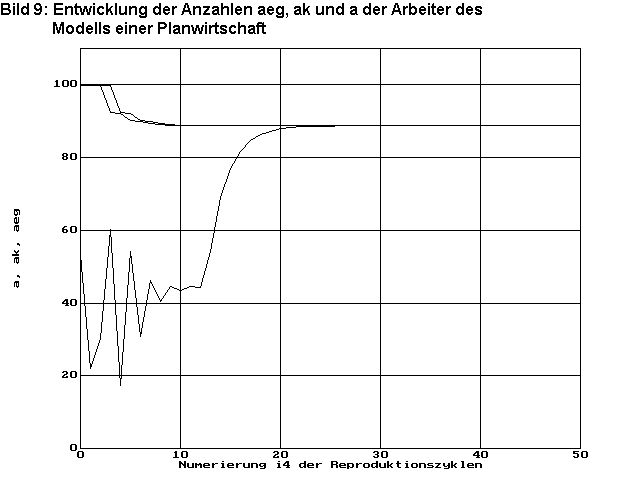 Bild 9 zeigt die Entwicklung der Bevölkerungszahl a, die Anzahl ak der versorgten Arbeiter und die Anzahl aeg der beschäftigten Arbeiter. Auch hier hat sich nach ca. 20 Reproduktionszyklen das Optimum eingestellt. Durch die anfänglichen wirtschaftlichen Disproportionen ist durch zeitweilige Unterversorgung der Bevölkerung die Bevölkerungszahl gesunken. Das ist in diesem Beispiel auf den anfänglichen Engpass der Güterart i3=3, die Gebäude, zurückzuführen. Da mit fa=1 keine Möglichkeit des Wiederanwachsens der Bevölkerung gegeben ist, muss sich die optimale Wirtschaftsstruktur jetzt auf einem niedrigeren Niveau einpegeln. Die anfängliche Unterbeschäftigung ist darauf zurückzuführen, dass durch geringere Produktion der Güter, bei denen Überbestände existieren, diese erst abgebaut werden. Da hier die Bevölkerung durch Warenzuweisung versorgt wird, entsteht durch die Unterbeschäftigung keine Unterversorgung der Arbeiter.