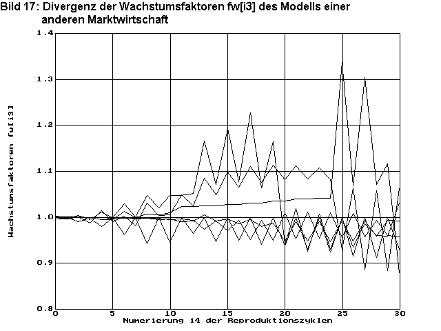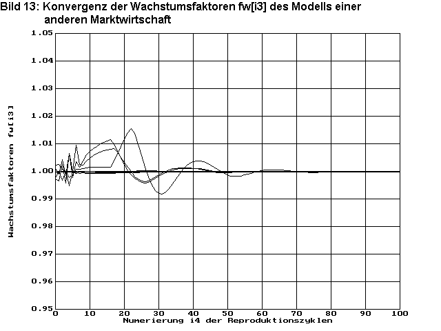 Bild 13 zeigt die Faktoren der Warenreproduktion fwi3, die bei fa=1 gegen eins streben sollen. Nach ca. 80 Reproduktionszyklen sind auch hier die sichtbaren Abweichungen vom Optimum abgeklungen. Schwankungen bei diesen Faktoren deuten auf Disproportionen in den realisierten Warenproduktionen hin. Diese zeigen offenbar eine geringere Neigung zur Konvergenz zum Optimum.