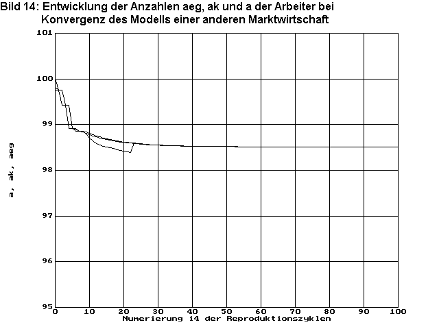 Bild 21 zeigt die Entwicklung der Bevölkerungszahl a, die Anzahl ak der versorgten Arbeiter und die Anzahl aeg der beschäftigten Arbeiter. Im ersten Reproduktionszyklus ist ein starker Rückgang der Bevölkerungszahl zu sehen, da offenbar beim Konsumgut i3=3 (Wohnraum) anfänglich ein Engpass besteht. Danach ist Vollversorgung und Vollbeschäftigung fast durchgängig gegeben, obwohl die Wirtschaftsstruktur noch ca. 50 Reproduktionszyklen bis zum Optimum benötigt. Da mit fa=1 keine Möglichkeit des Wiederanwachsens der Bevölkerung gegeben ist, muss sich die optimale Wirtschaftsstruktur jetzt auf einem niedrigeren Niveau einpegeln.