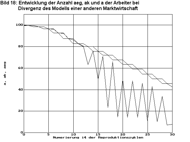 Bild 18 zeigt die Anzahl a der Arbeiter, die Anzahl ak der versorgten Arbeiter und die Anzahl aeg der beschäftigten Arbeiter . Auch hier ist das Aufschaukeln des instabilen Systems deutlich zu erkennen, mit dem Effekt, dass durch Unterversorgung und Unterbeschäftigung die Bevölkerung zugrunde geht.