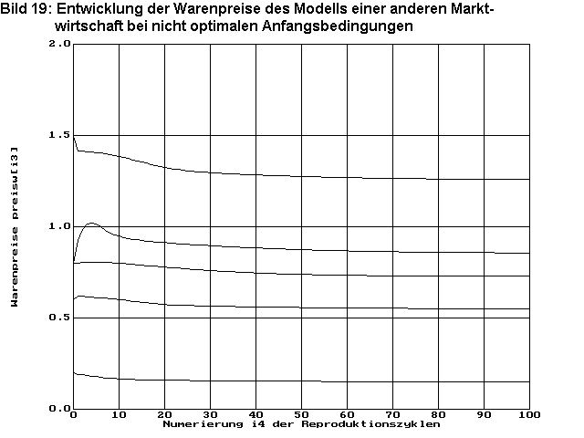 Bild 12 zeigt die Preisentwicklung der Ware i3=1 stellvertretend für alle anderen Waren über 20 Reproduktionszyklen. Nach ca. 10 Zyklen ist die durch Rundung entstandene sichtbare Abweichung vom Optimum bereits abgeklungen.