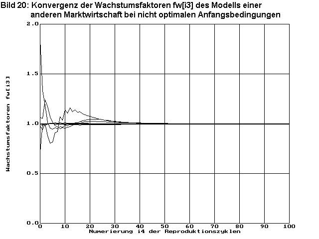 Bild 20 zeigt die Faktoren der Warenakkumulation fwi3, die bei fa=1 gegen eins streben müssen. Hier ist nach anfänglichen starken Schwankungen innerhalb von 50 Reproduktionszyklen das Optimum ebenfalls erreicht. (Vergleiche auch mit Bild 8.)
