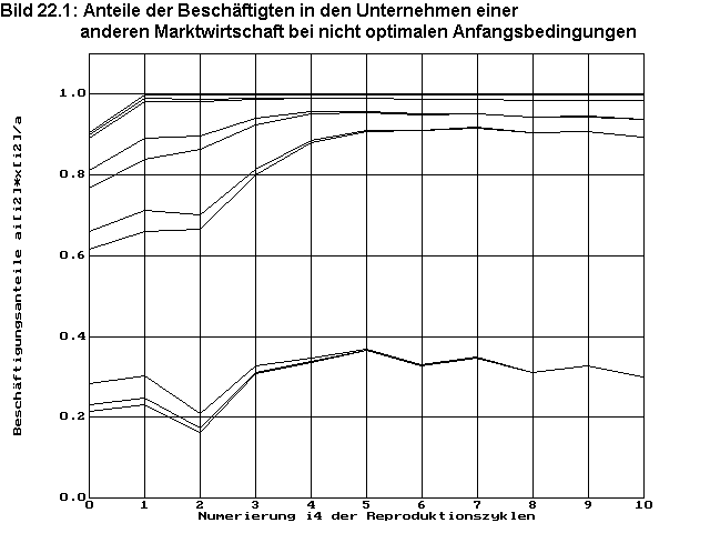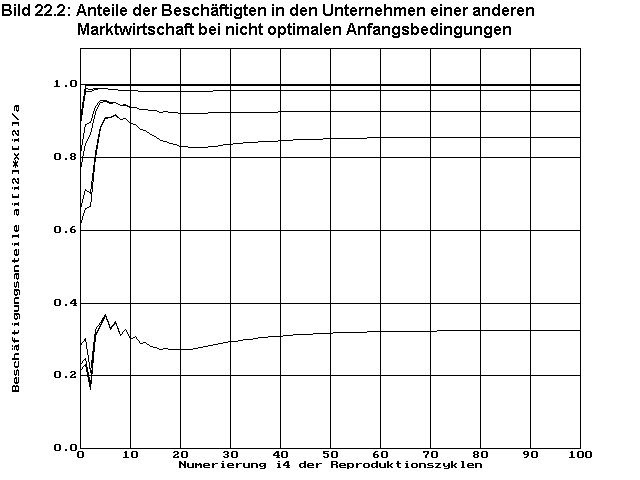 Bild 22.1 und Bild 22.2 zeigen die Verteilung der beschäftigten Arbeiter auf die verschiedenen Unternehmen über verschiedene Zeitintervalle. Im Bild 22.1 ist zu erkennen, wie die nicht so produktiven Unternehmen innerhalb der ersten 10 Reproduktionszyklen aus der Wirtschaft verdrängt werden. Im Bild 22.2 ist dann zu erkennen, wie sich zwischen den verbleibenden produktivsten Unternehmen optimale Proportionen im Produktionsvolumen einstellen.
