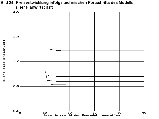 Nun wird das Verhalten des Modells einer Planwirtschaft untersucht. Es wurden 50 Reproduktionszyklen berechnet. In den ersten 10 Zyklen herrschen noch optimale Verhältnisse nach dem bisherigen Entwicklungsstand der Produktivkräfte. Vom 10. zum 11. Zyklus hat sich das Produktionsverfahren i2=13 sprunghaft verbessert. Es beginnt ein Selbstoptimierungsprozess. Beim 50. Zyklus hat sich die neue optimale Wirtschaftsstruktur bereits wieder eingestellt.