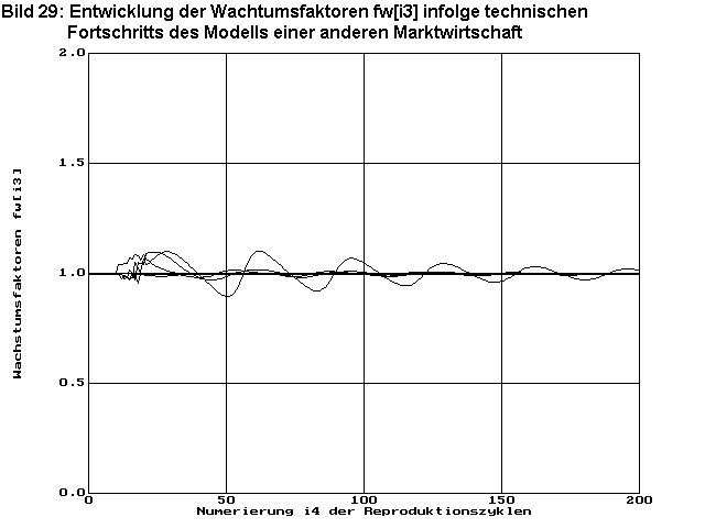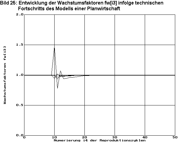 Bild 25 zeigt die Entwicklung der Wachstumsfaktoren fwi3 in den einzelnen Warenarten. Diese zeigen wie das Optimum der Wirtschaftsstruktur durch Einführung der Innovation zunächst gestört wird und wie diese Störung wieder abklingt. In diesem Modell sind die sichtbaren Störungen nach ca. 20 Zyklen abgeklungen.
