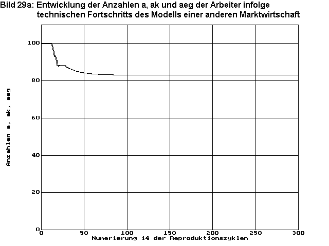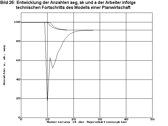 Bild 26 zeigt die Entwicklung der Bevölkerungszahlen a, die Anzahl ak der versorgten Arbeiter und die Anzahl aeg der beschäftigten Arbeiter. Der plötzliche eingeleitete Strukturwandel bewirkt zunächst eine Unterversorgung der Bevölkerung und damit ein Sinken der Bevölkerungszahl. Nach ca. 7 Zyklen ist wieder Vollversorgung (rak=1) gegeben. Wegen des vorgegebenen Wachstumsfaktors fa=1 in diesem Beispiel kann der Bevölkerungsverlust nicht wieder ausgeglichen werden und die optimale Wirtschaftsstruktur muss sich auf einem niedrigeren Niveau einpegeln. Durch den geringeren Bedarf an Warenbeständen wg, der im Wesentlichen aus dem Bevölkerungsschwund resultiert, kommt es zu Teilbeschäftigung aeg<a, die nach ca. 25 Zyklen wieder vorbei ist. In diesem Modell ist Unterbeschäftigung aber keine Ursache für Unterversorgung, weil die Arbeiter die Konsumgüter nicht für erarbeiteten Lohn kaufen, sondern in Abhängigkeit der verfügbaren Waren zugewiesen bekommen.