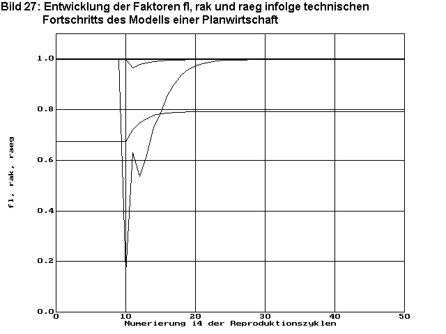 Bild 27 zeigt die Entwicklung des Faktors fl des zusätzlichen Konsums (neben den Faktoren rak und raeg). Der zusätzliche Konsum steigt innerhalb von ca. 10 Zyklen auf das neue Niveau an. Bemerkenswert ist hier, dass einerseits die Bevölkerungszahl wegen Unterversorgung mit den notwendigen Konsumgütern sinkt und anderseits sofort der Faktor des zusätzlichen Konsums steigt. Würde man ein derartiges Anpassungsverhalten der Wirtschaft in einem realen Wirtschaftssystem beobachten, wäre das dringend verbesserungsbedürftig.