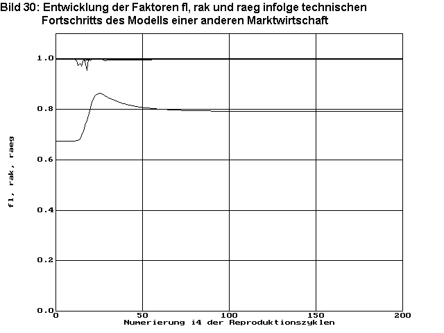 Bild 30 zeigt die Entwicklung des Faktors fl des zusätzlichen Konsums (neben den Faktoren rak und raeg). Auch in diesem Modell steigt der Faktor fl sofort stark an, obwohl unter anderem dadurch zunächst nicht die volle Versorgung der Arbeiter mit den notwendigen Konsumgütern gegeben ist. Der Faktor fl schwingt sogar noch über und strebt erst danach den neuen Optimalwert an. Es kann also auch bei diesem Modell einer Marktwirtschaft für dieses Beispiel noch nicht von einer sozialen Marktwirtschaft die Rede sein.