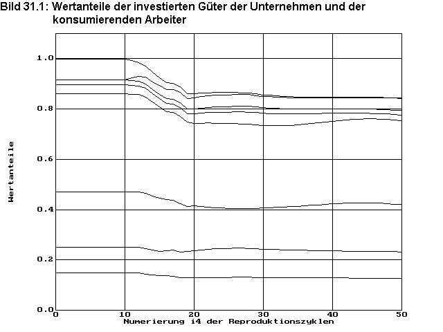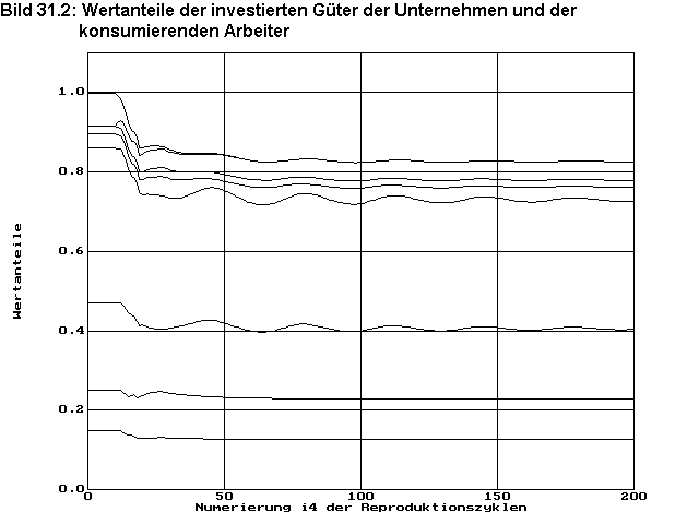 Einen interessanten Einblick in den simulierten Strukturwandel gibt Bild 31.1. Hier wurden übereinander geschichtet die Wertanteile der investierten Güter der einzelnen Unternehmen und der konsumierenden Arbeiter angegeben. Der Wert Eins entspricht dem Gesamtwert aller verfügbaren Waren zu aktuellen Preisen. Damit zeigt die oberste Kurve den anteiligen Gesamtwert der z.Z. für die Reproduktion genutzten Waren. Die Differenz zwischen Eins und der obersten Kurve zeigt den wertmäßigen Anteil der z.Z. nicht genutzten Waren. Der Zwischenraum zwischen der obersten Kurve und der nächsten darunterliegenden zeigt den wertmäßigen Wareninput des Unternehmens i2=15, welches bis zum 10.Zyklus noch das produktivsten Unternehmen seiner Branche ist und deshalb an der bisherigen optimalen Wirtschaftsstruktur beteiligt ist. Der nächste Zwischenraum zwischen der 2. und der 3. Kurve zeigt den wertmäßigen Wareninput des Unternehmens i2=13, welches nach Einführung der Innovation das produktivste Unternehmen der Branche ist und das Unternehmen i2=15 vom Markt verdrängt. Diese Verdrängung ist in diesem Diagramm von Zyklus i4=10 bis 40 gut zu erkennen. Bild 31.2 zeigt den gleichen Sachverhalt mit einem anderen Maßstab der Zeitachse über alle 200 berechneten Reproduktionszyklen. Hier ist zu erkennen, wie nach Vollendung der Verdrängung infolge der Störung des Wirtschaftssystem ein langsames Abklingen von Schwingungen in der Struktur erfolgt, die auch in Bild 29 zu sehen waren, die sich in ihrer Endphase aber nicht mehr negativ auf die Versorgung und die Beschäftigung der Arbeiter auswirken.