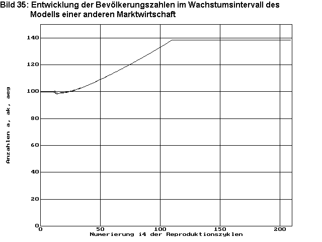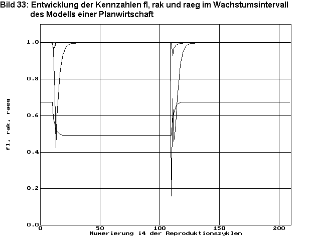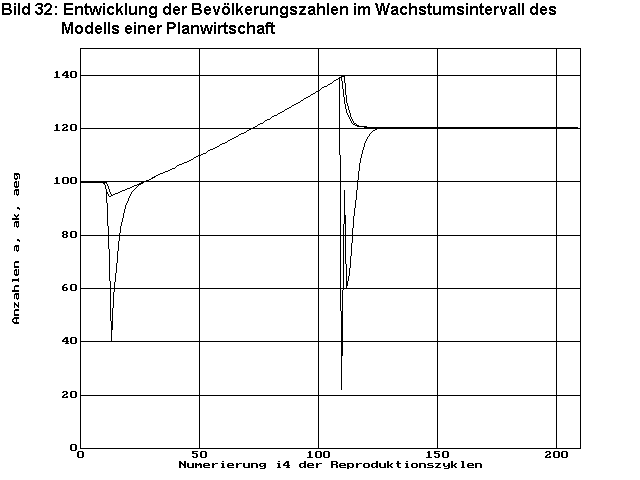 Bild 32 zeigt die Entwicklung der Bevölkerungszahlen a, sowie die Zahlen ak der versorgten und die Zahlen aeg der beschäftigten Arbeiter. Da bei Zyklus 11 diese plötzliche Änderung des Bestrebens der Bevölkerung sich zu vermehren eine Störung der Wirtschaft bedeutet, gibt es eine Störung in der Versorgung der Bevölkerung ak<a und damit kurzzeitig einen Rückgang der Bevölkerungszahlen a. Mit dem plötzlichen Rückgang der Bevölkerungszahlen entsteht auch ein Rückgang im Bedarf mindestens einiger Güter. Da die Planwirtschaft so programmiert ist, dass nur produziert wird, was benötigt wird und Überbestände an Waren möglichst abgebaut werden, entsteht kurzfristig ein starker Einbruch in der Beschäftigung aeg. Da die Versorgung der Bevölkerung in diesem Modell nicht über Lohnarbeit an die Beschäftigung gebunden ist, bewirkt dieser starke Beschäftigungseinbruch keinen weiteren Einbruch in der Versorgung, so dass auch keine Blockierung der Wirtschaft provoziert wird. Der Bevölkerungsverlust ist nach ca. 15 Zyklen wieder ausgeglichen und die Bevölkerungszahl wächst kontinuierlich weiter. Auch die Unterbeschäftigung ist nach ca.15 Zyklen beendet, und es besteht eine neue optimale Wirtschaftsstruktur mit einem entsprechendem Bevölkerungs- und Wirtschaftswachstum.