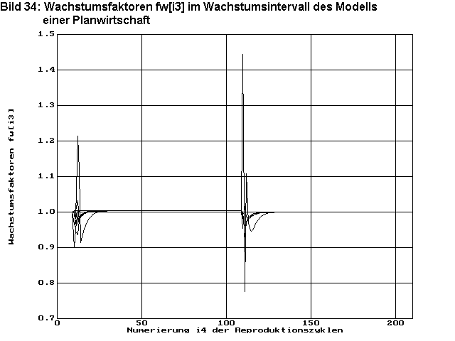 Bild 34 zeigt die Entwicklung der Wachstumsfaktoren fwi3 der gesamtgesellschaftlichen Güterbestände. Die starken Ausschläge dieser Faktoren nach dem 10. und dem 110.Zyklus zeigen die starke Reaktion des Systems auf diese Störung, die dann ziemlich schnell nach 12 bis 15 Zyklen wieder abgeklungen ist. Im Wachstumsintervall zwischen i4=10 bis 111 pegeln sich die Faktoren fwi3 nach dem Abklingen der Störung erwartungsgemäß auf einem Niveau knapp über Eins ein, nämlich exakt auf 1,004.