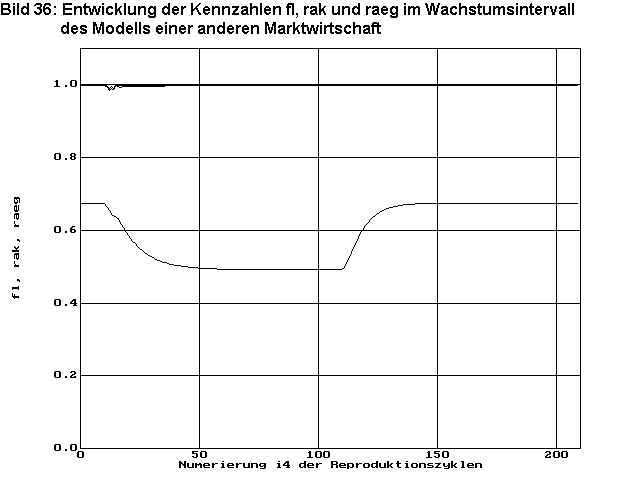 Bild 35 zeigt wieder die Entwicklung der Bevölkerungszahlen a, sowie die Zahlen ak der versorgten und die Zahlen aeg der beschäftigten Arbeiter. Nach dem plötzlichen Übergang von fa=1 auf fa=1,004 bei Zyklus 11 ergibt sich auch hier ein Einbruch in der Bevölkerungszahl wegen Unterversorgung. Er ist allerdings nicht so bizarr wie bei meinem Modell der Planwirtschaft. Durch die Faktoren f3=0,05 und f5=0,05 die hier klein gewählt wurden, wird eine allmähliche Anpassung an die neuen Wirtschaftsbedingungen bewirkt. Da in diesem Marktwirtschaftsmodell die Versorgung der Bevölkerung über die Lohnarbeit an die Beschäftigung gekoppelt ist, muss verhindert werden, dass durch starke Nachfrageschwankungen starke Beschäftigungsschwankungen auftreten, die dann wiederum zu Unterversorgung wegen Geldmangels und damit zu Bevölkerungsrückgang, weiterem Nachfragerückgang, weiterem Beschäftigungsrückgang u.s.w. führen, was dann letztendlich zur Blockierung der gesamten Wirtschaft führen würde. Deshalb ist ein relativ großer Faktor f4=5 gewählt, der die Größe der Warenreserven auf dem Markt festlegt. Dadurch wird trotz einiger Warenüberschüssen auf dem Markt die Produktion nicht gleich gedrosselt, so dass die Störung einigermaßen gut überstanden wird.