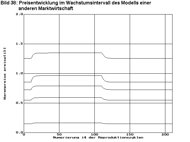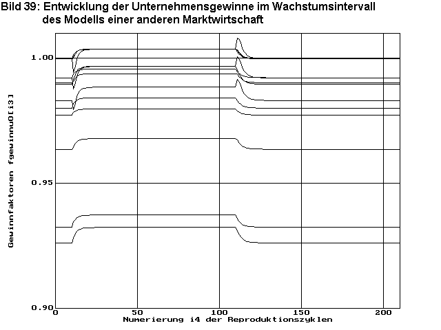 Bild 38 zeigt die Entwicklung der Warenpreise preiswi3 ,und Bild 39zeigt die Entwicklung der Gewinnfaktoren fgewinnu0i2 . Es ist zu erkennen, dass im Intervall des Bevölkerungswachstums und damit auch des Wirtschaftswachstums das Niveau der Preise und der Gewinne erhöht ist.