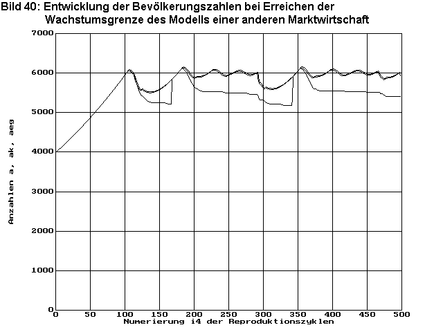 Schauen wir uns zunächst das Verhalten des Modells einer anderen Marktwirtschaft an. Bild 40 zeigt die Entwicklung der Bevölkerungszahlen a, die Zahlen ak der versorgten Arbeiter und die Zahlen aeg der beschäftigten Arbeiter. Es stellen sich zeitliche Schwankungen ein in Folge von Unterbeschäftigung, Unterversorgung und damit Bevölkerungsrückgang. Nach jedem Einbruch erfolgt offenbar wieder ein Versuch Bevölkerungswachstum und Wirtschaftswachstum zu realisieren. Diese Erscheinungen lassen die Vermutung zu, dass es sich hier um eine Abbildung zyklischer Krisen durch mein Modell handelt, wie wir sie aus dem realen Kapitalismus kennen.