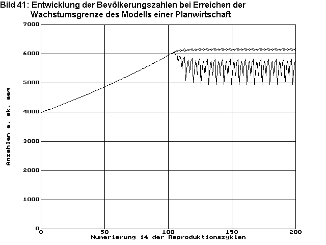 Schauen wir uns noch an, wie sich das Modell einer Planwirtschaft in diesem Fall verhält. Bild 41 zeigt wieder die Entwicklung der Bevölkerungszahlen u.s.w. Auch mein Planwirtschaftsmodell hat Probleme mit der Stabilität. Hier entstehen Schwankungen mit einer Periode von drei Reproduktionszyklen.