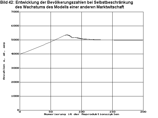 Es wurde versucht den Prozess der Selbstbeschränkung des Wachstums mit dem Modell einer anderen Marktwirtschaft einmal zu simulieren. In unserem Demonstrationsbeispiel ist nach 70 Reproduktionszyklen die Bevölkerungszahl von 5270 erreicht. Jetzt wird über den Zeitraum von 20 Zyklen der Faktor fa von 1,004 kontinuierlich auf 1,000 abgesenkt und dann konstant auf 1 gehalten. Bild 42 zeigt wieder die Entwicklung der Bevölkerungszahlen u.s.w. Trotz der kontinuierlichen Absenkung des Wachstumsfaktors fa gibt es aufgrund der notwendigen Strukturänderungen der Wirtschaft einen Bevölkerungsrückgang, der sonst noch wesentlich stärker wäre. Anschließend stellt sich unter der Grenze des Maximums der möglichen Bevölkerungszahl und der möglichen Expansion der Wirtschaft eine optimale nicht wachsende Wirtschaftsstruktur ein. Falls im Rahmen eines späteren technischen Fortschritts durch bodensparende Technologien oder durch Erschließung bisher nicht nutzbarer Ressourcen (natürlich umweltverträglich) ein weiteres Wachstum möglich wird, könnten dann durch andere sozialpolitische Maßnahmen das Bevölkerungswachstum wieder angeregt werden. Dieses Beispiel zeigt bereits deutlich, dass es wohl kein soziales Wirtschaftssystem geben kann, welches man sich selbst überlässt in der Hoffnung, es wird schon alles richten. Das zu behaupten wäre naive oder verlogene Ideologie.
